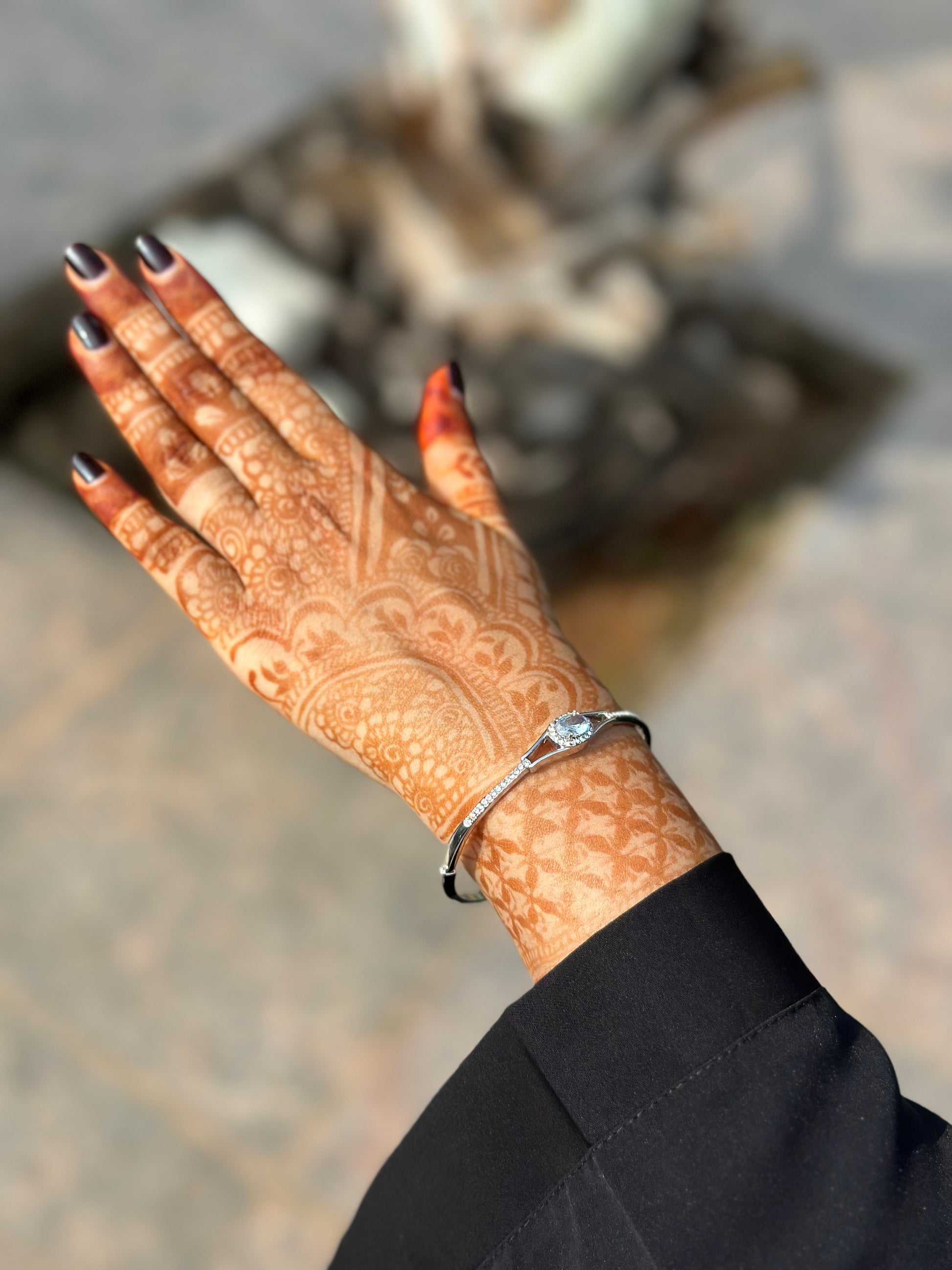 An elegant silver bracelet adorned with shimmering crystals for a timeless look. Designed with an anti-tarnish finish to preserve its shine, it features a free-size fit for everyday comfort and style. Perfect for both casual and special occasions.