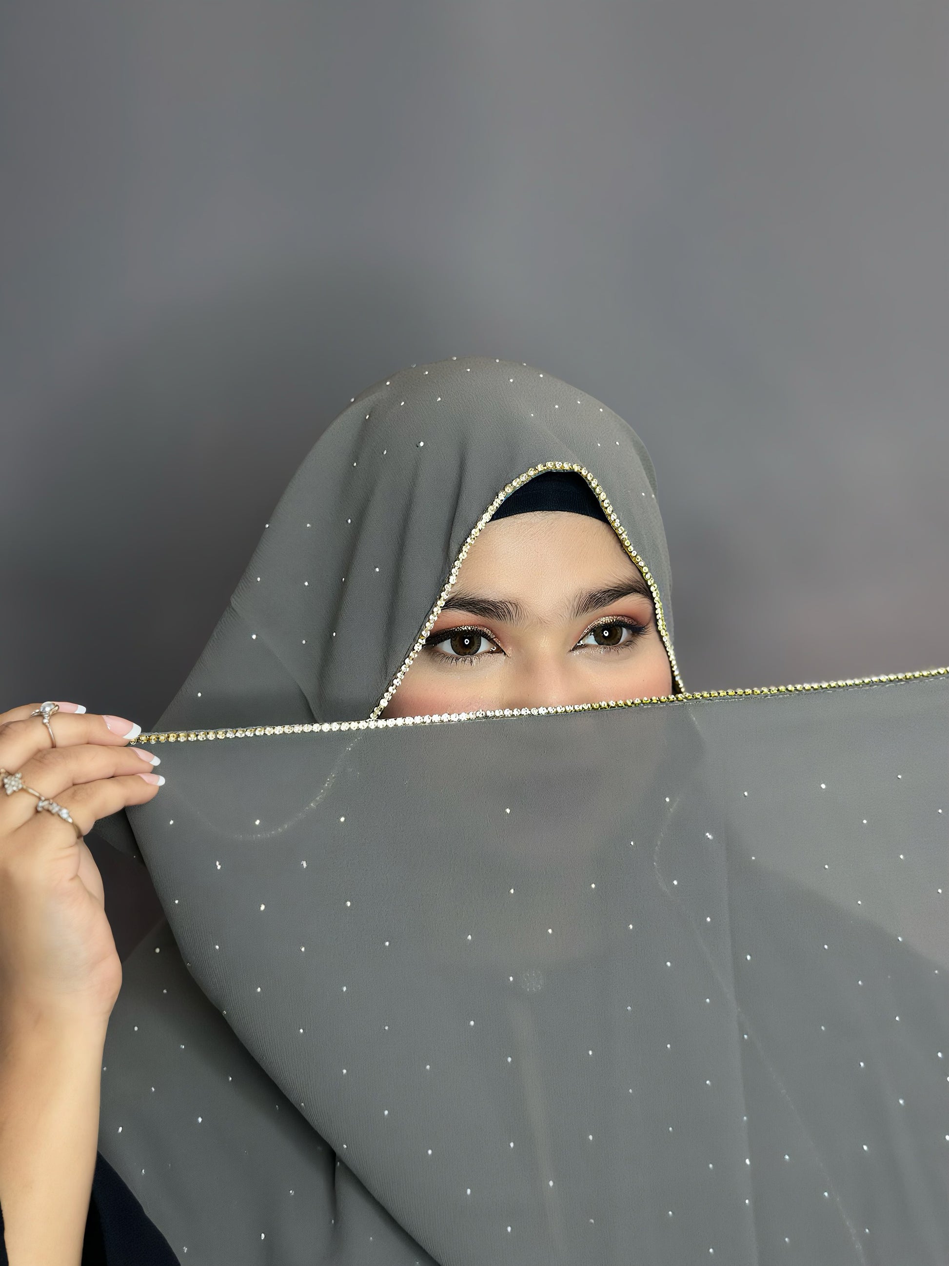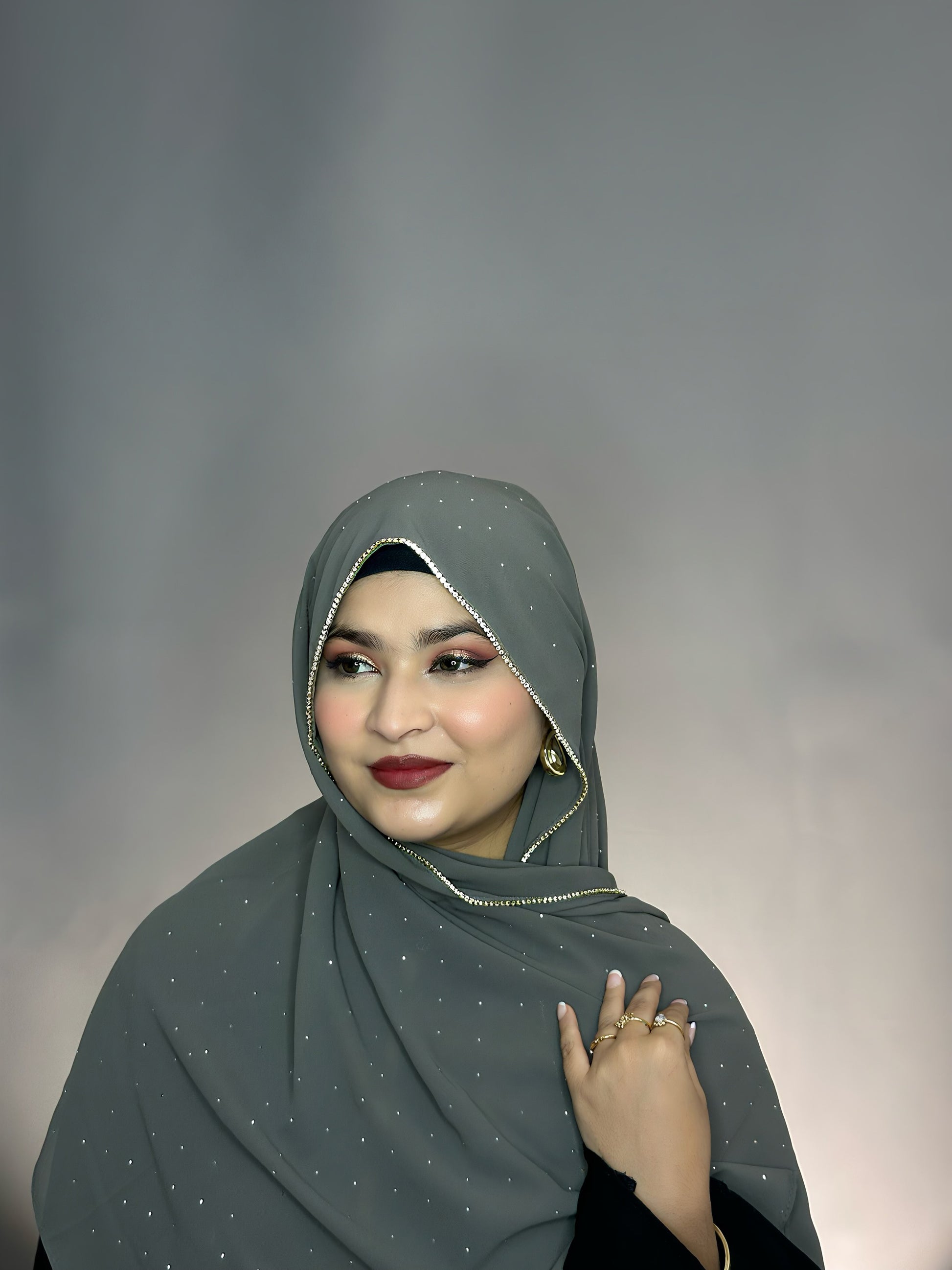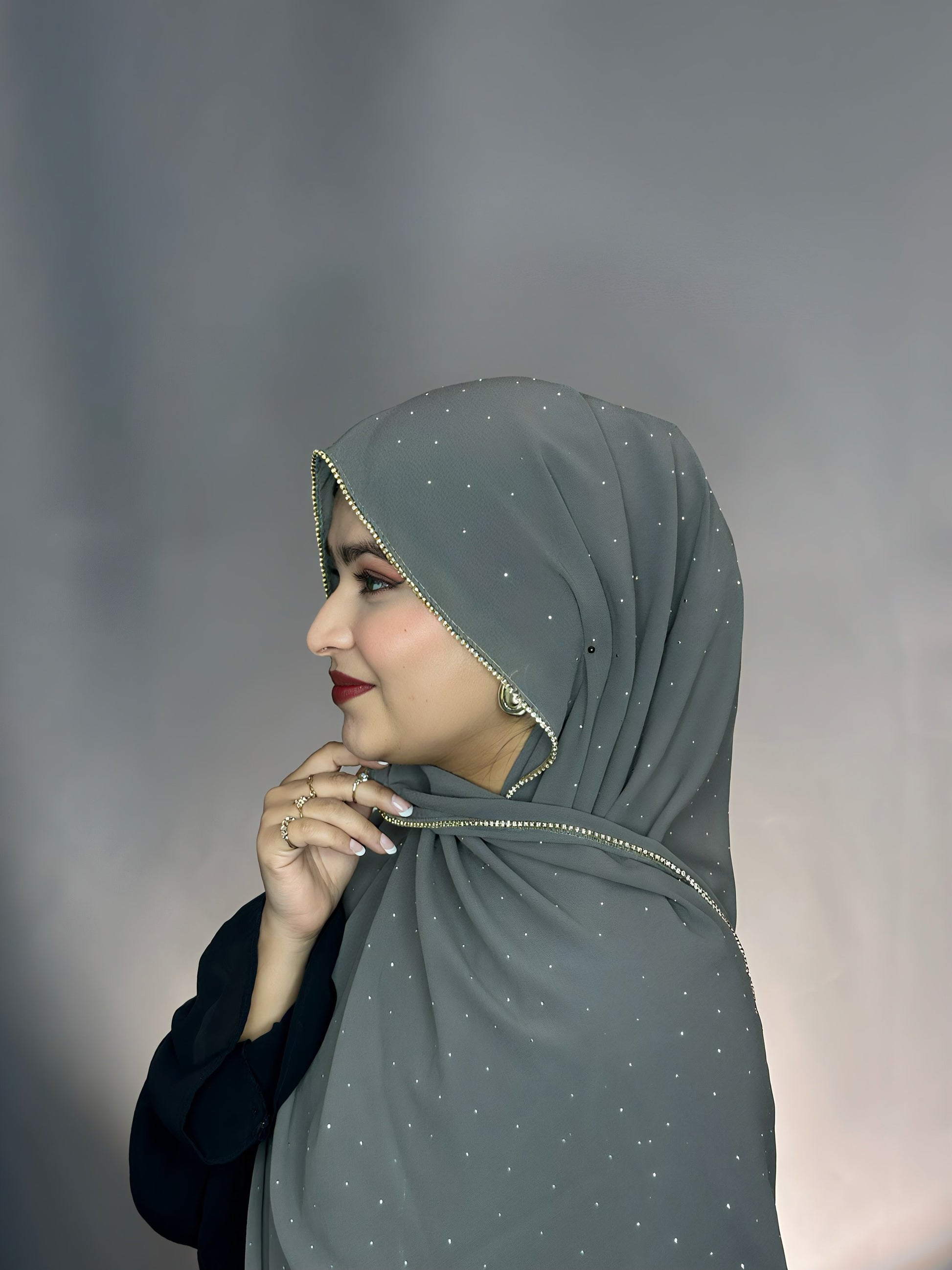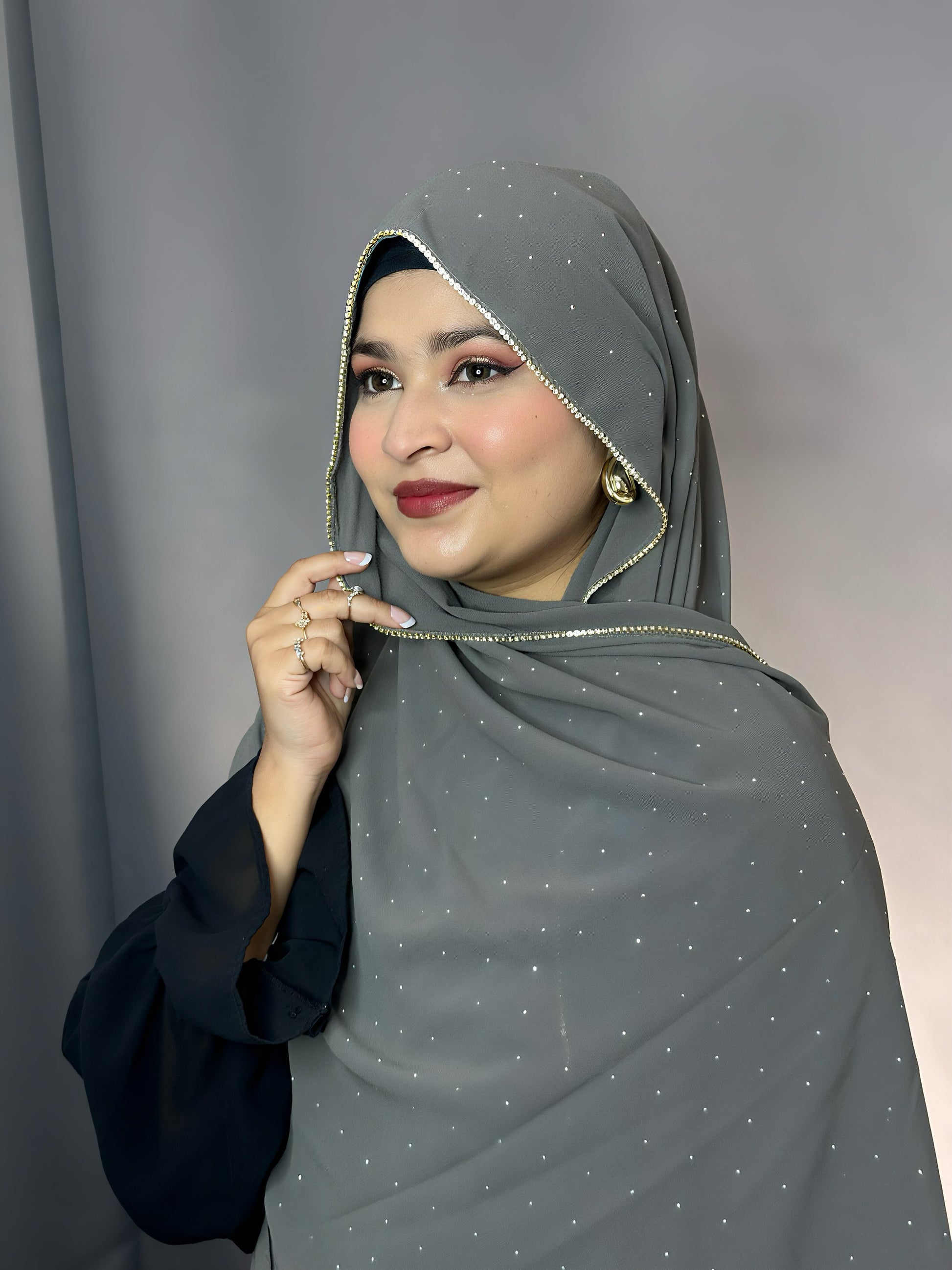 A soft georgette hijab adorned with sparkling rhinestones for a touch of glamour. Lightweight, comfortable and perfect for parties,
