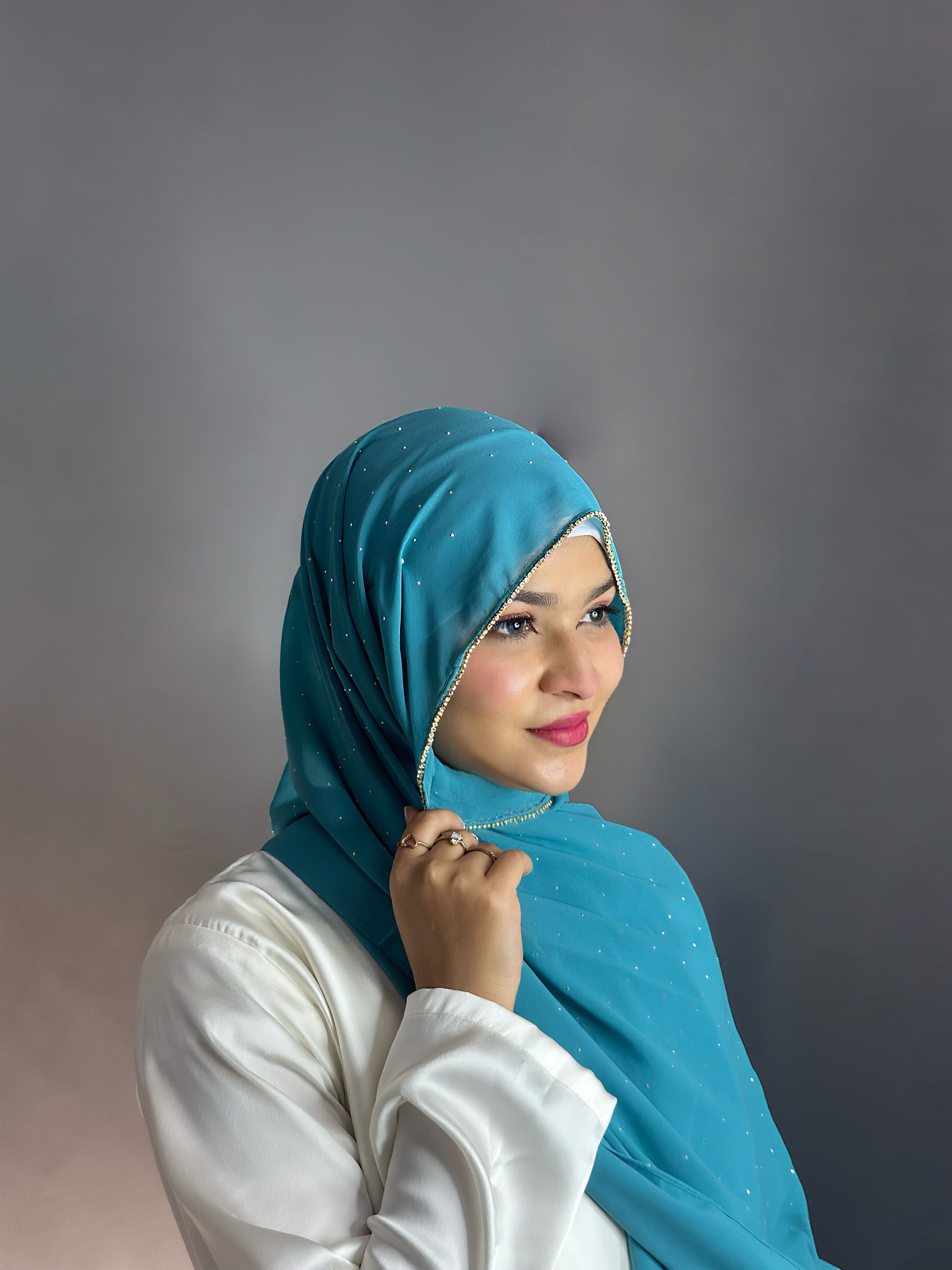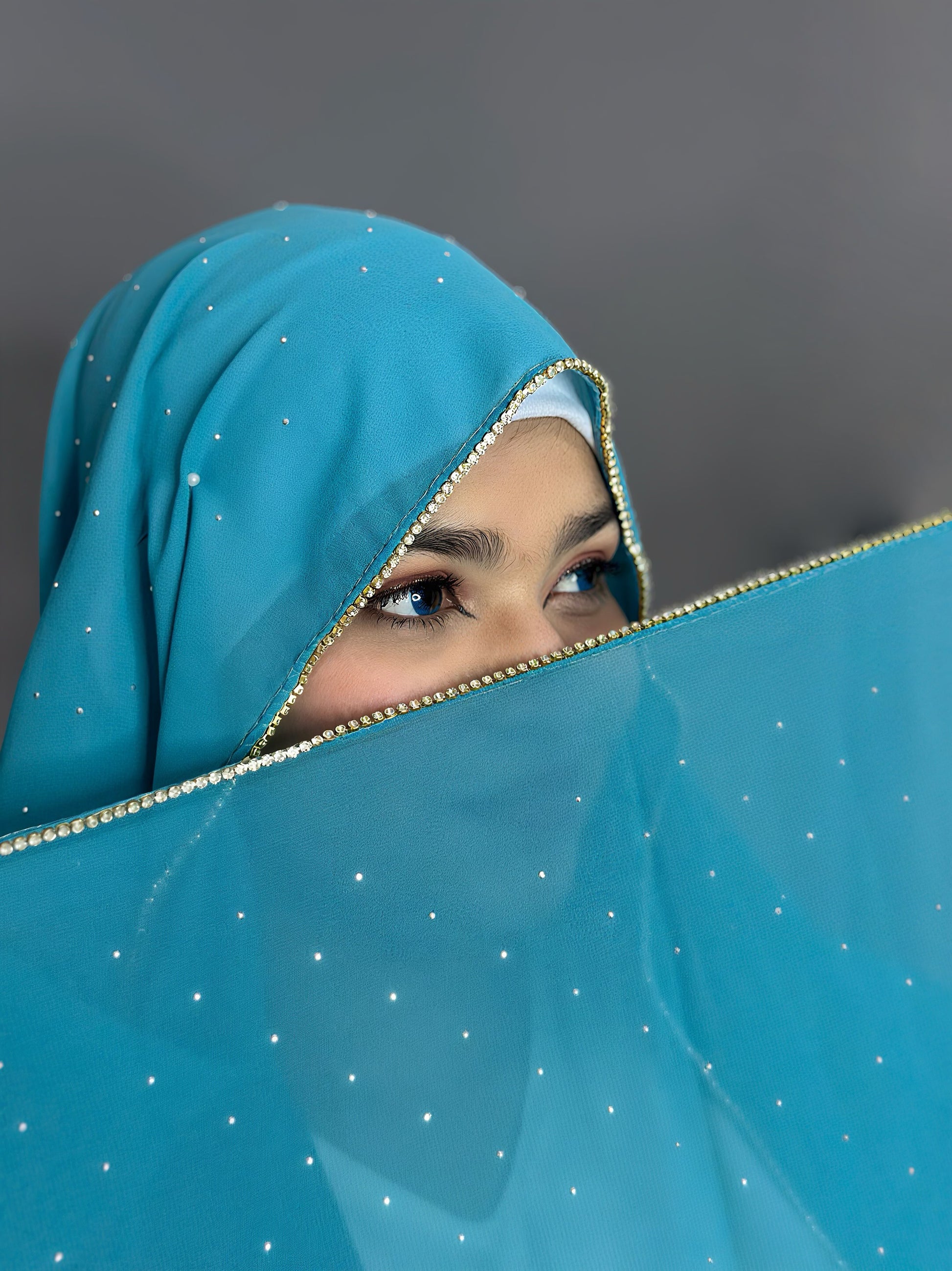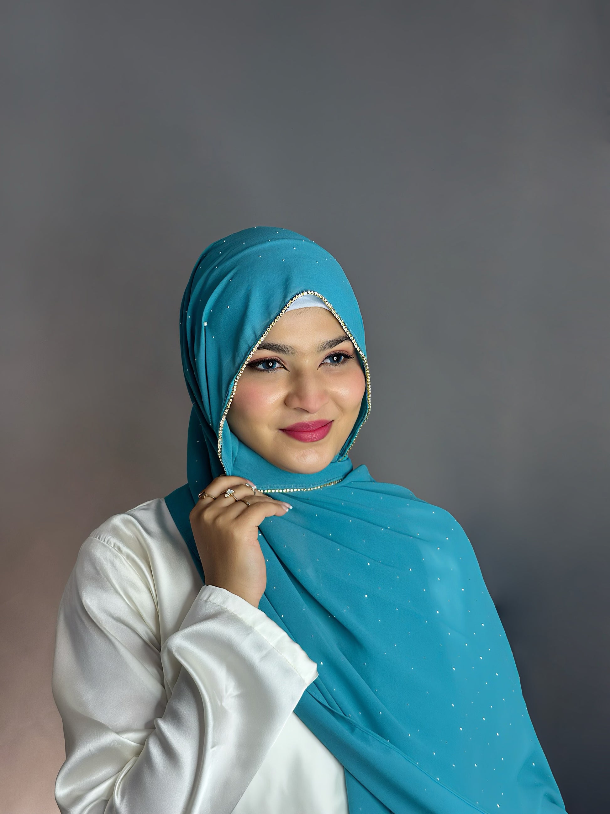 A soft georgette hijab adorned with sparkling rhinestones for a touch of glamour. Lightweight, comfortable, and perfect for parties, weddings and special occasions.