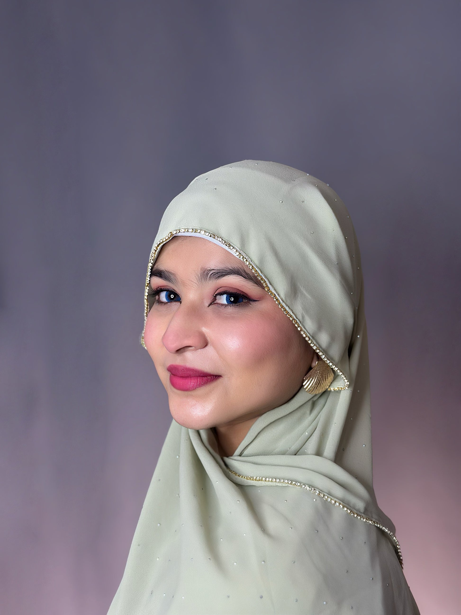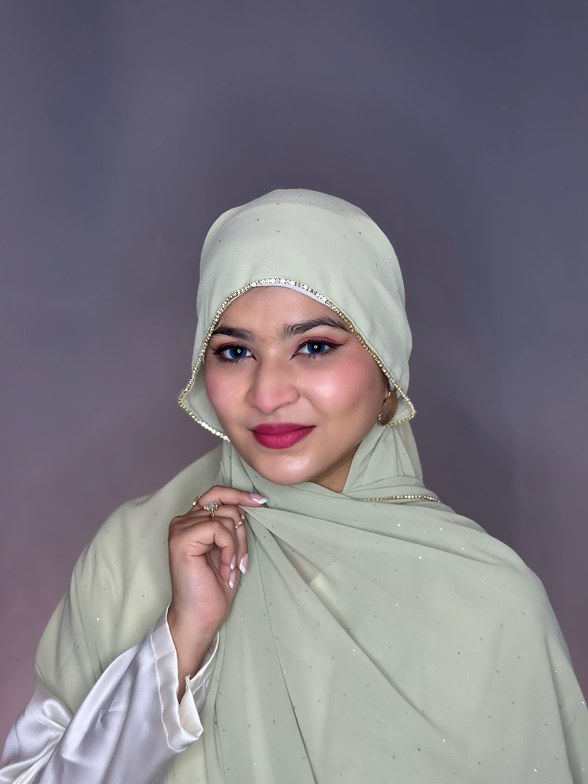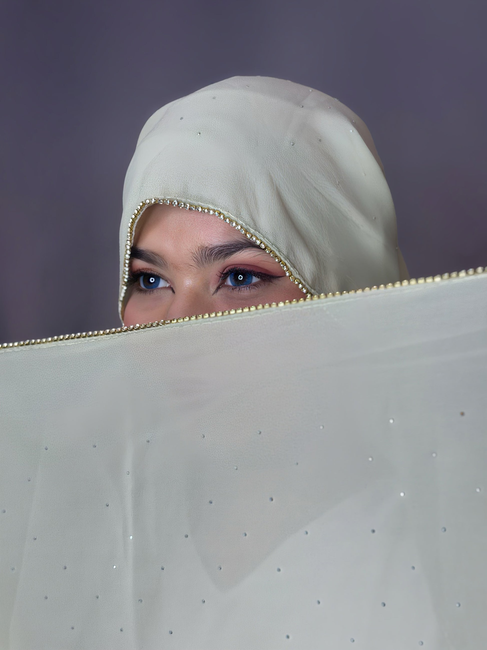 A soft georgette hijab adorned with sparkling rhinestones for a touch of glamour. Lightweight, comfortable, and perfect for parties, weddings and special occasions